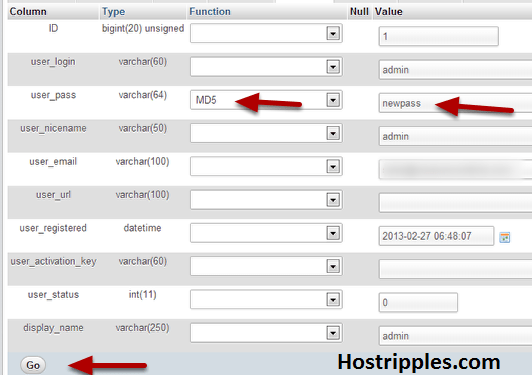n the user_pass column, select MD5 and type in the new admin password. Hit GO when you are done.