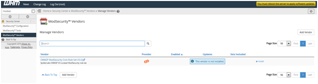 For managing your ModSecurity Vendors WHM provides a tool which is ‘ModSecurity Vendors’.