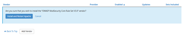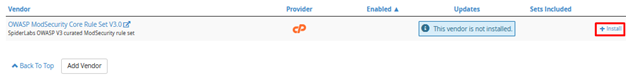 For installing a cPanel-provided “ModSecurity Vendor”, first click “Install” for the specified vendor