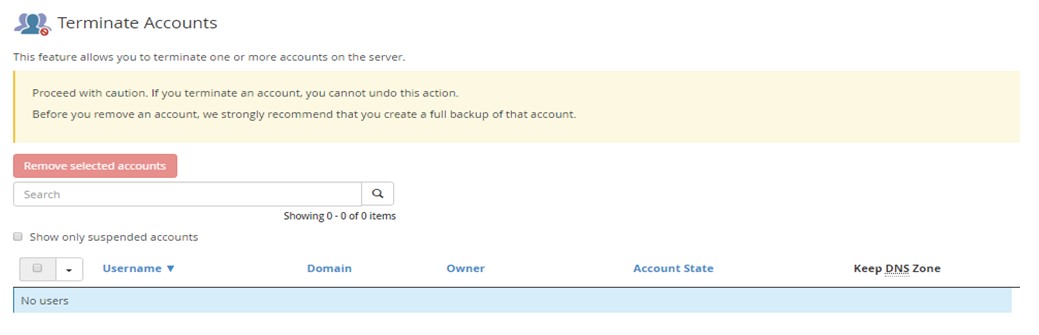- You can use WHMs’ “Terminate Accounts” interface. Follow the below steps for accessing the “Terminate Accounts” interface: